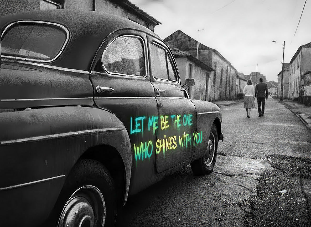 Exclusive, custom-designed T-shirt featuring a black and white image of a vintage car daubed with graffiti lyrics reading 'let me be the one who shines with you' (those who know, will know). Hand printed on a white 100% cotton soft T-Shirt. Only available at Ironic Art Creation.