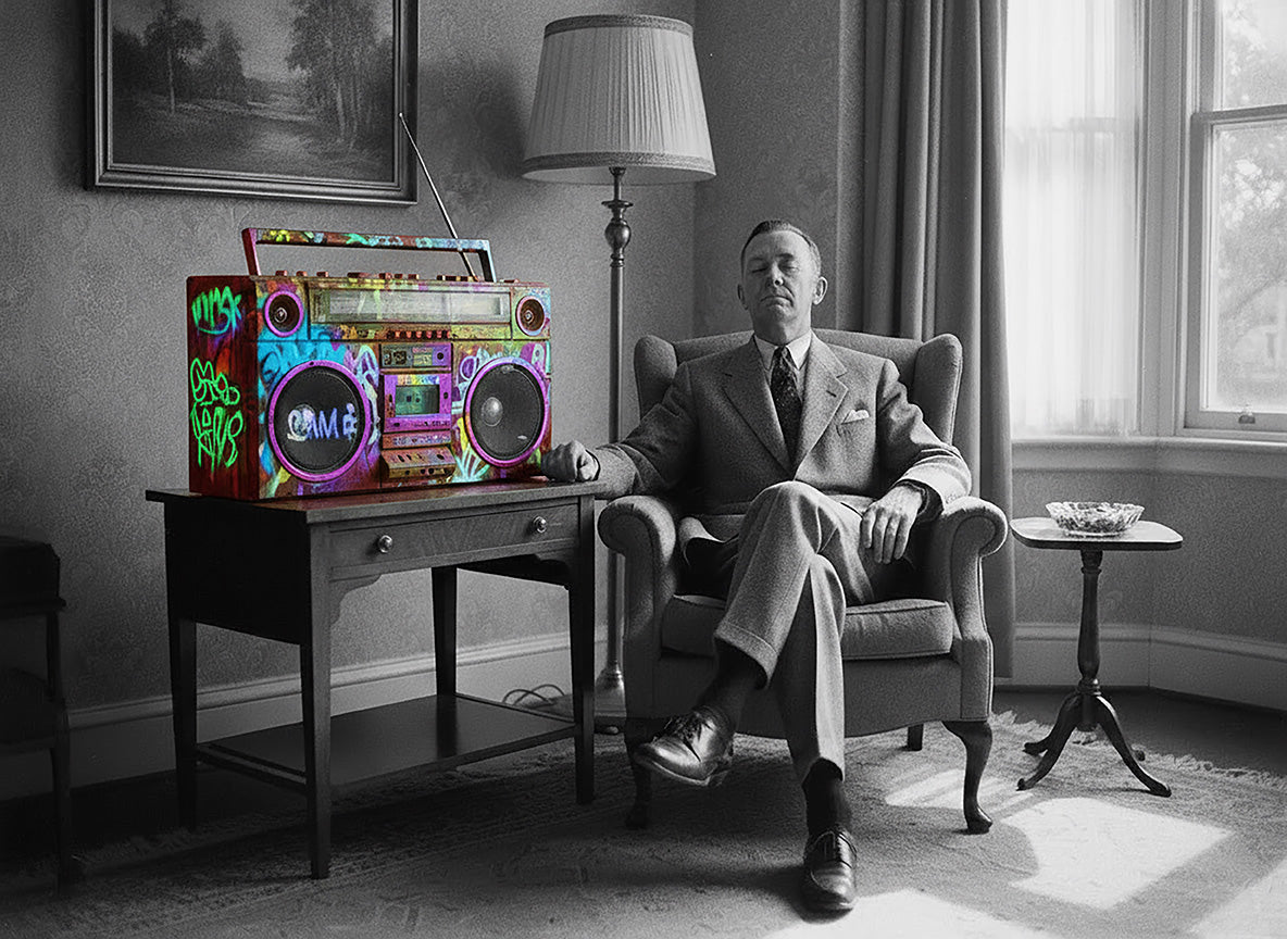Unique custom designed T-shirt featuring a black and white image of a suited gentleman relaxing in his 1950's home, contrasted with vibrant, graffiti style, boombox. Hand printed on a white 100% cotton soft T-Shirt. Exclusive design, only available at Ironic Art Creation.